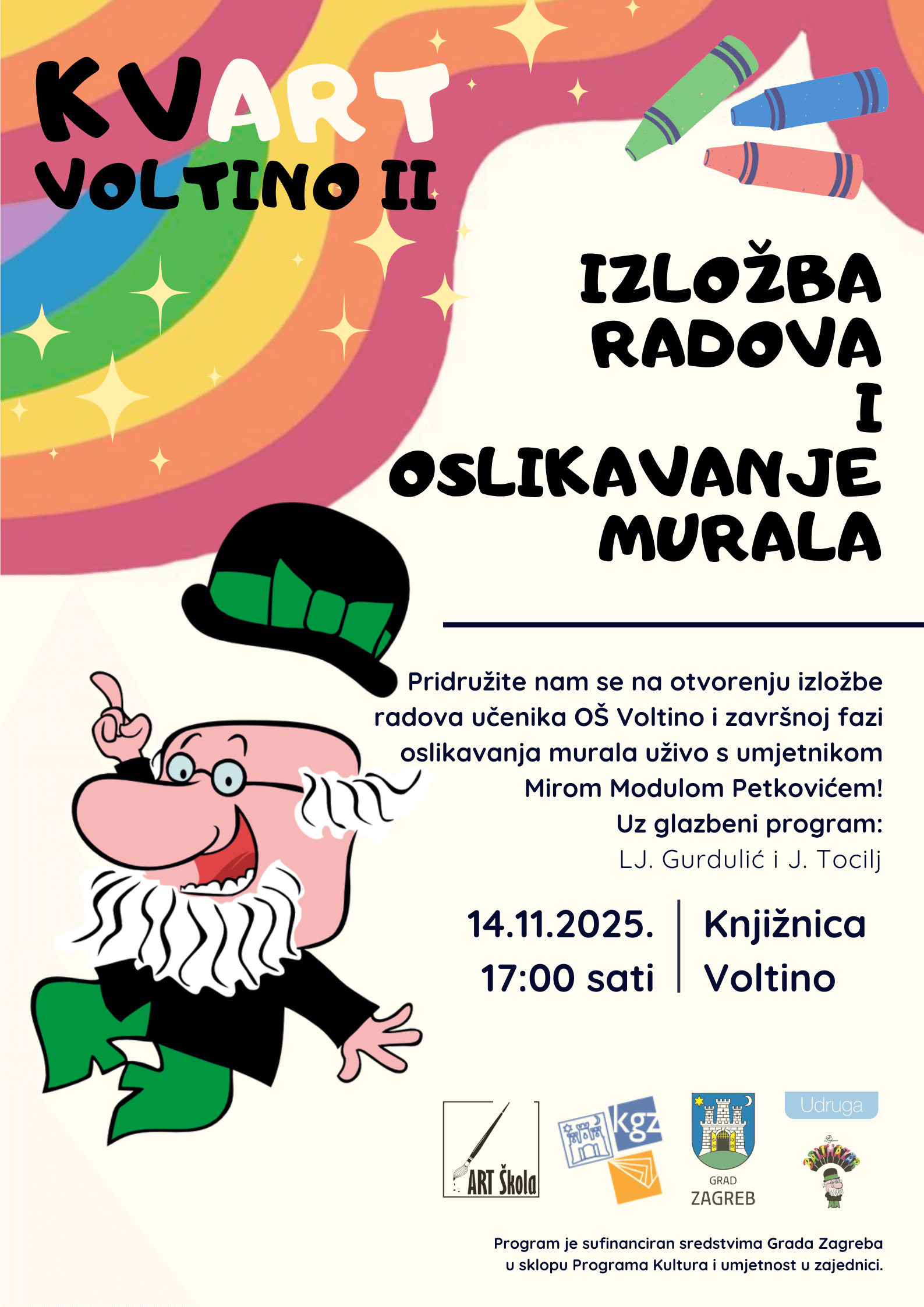 Udruga "Art škola" u partnerstvu s KGZ – Knjižnicom Voltino tijekom listopada i studenog 2025. godine, provela je niz umjetničkih aktivnosti kroz suradnju s građanima s ciljem jačanja kulturnog identiteta kvarta i poticanja zajedništva kroz umjetničko stvaralaštvo!