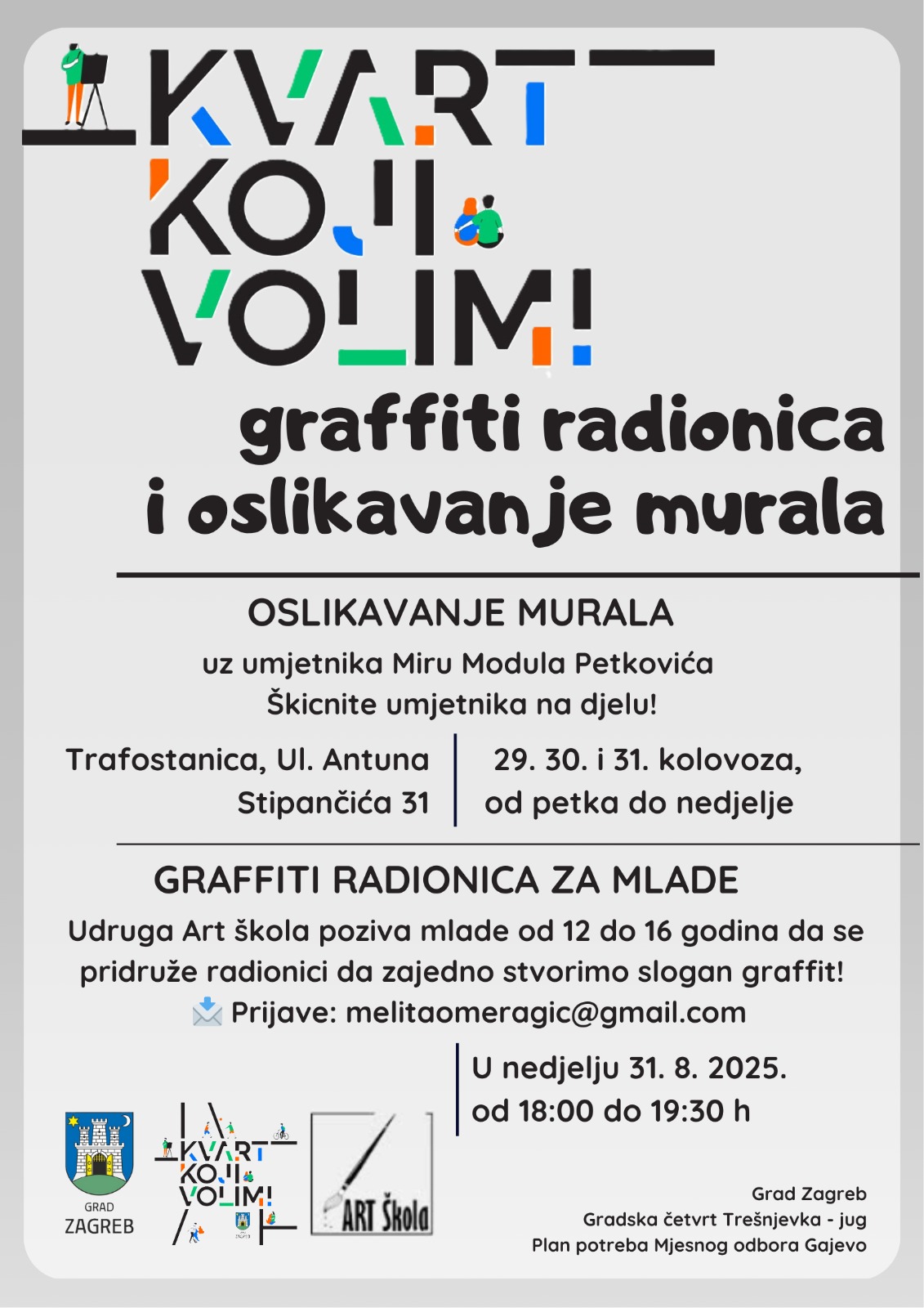 U nedjelju, 31.08., od 18:00 do 19:30 sati, mladi od 12 do 16 godina pridružili su se besplatnoj graffiti radionici. Radionicu su vodile kiparica Melita Omeragić i povjesničarka umjetnosti Daniela Bilopavlović Bedenik. Sudionici su se upoznali s osnovama muralizma i street arta, zajednički osmislili slogan za kvart koji odražava vrijednosti zajedništva, poštovanja i odgovornosti te su uz podršku Mire Modula izradili vlastiti zajednički grafit na stretch foliji.